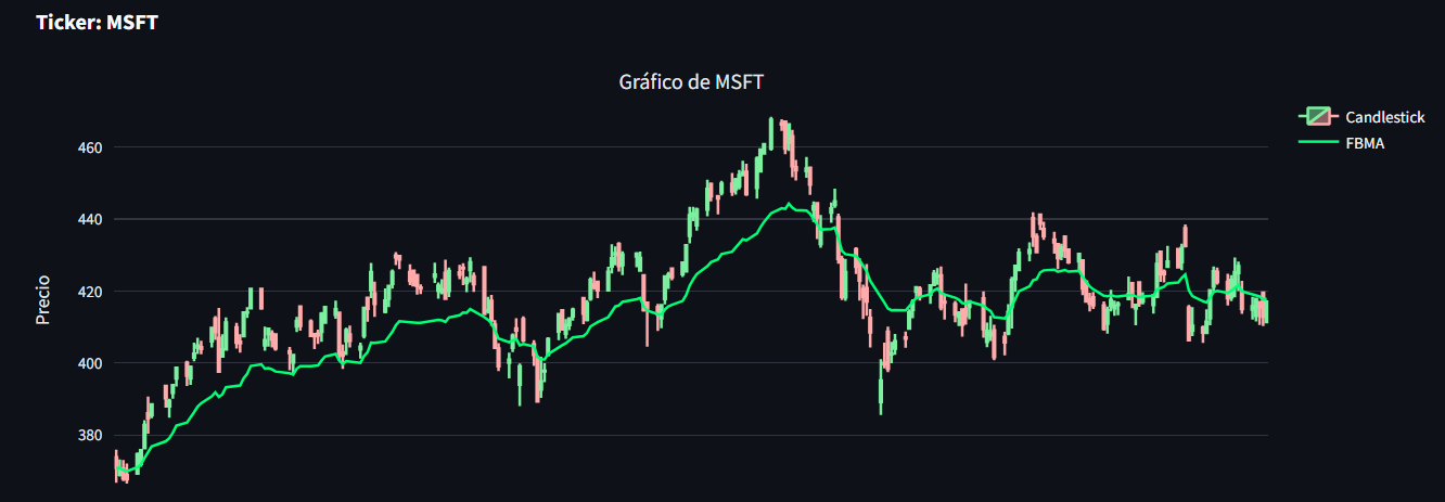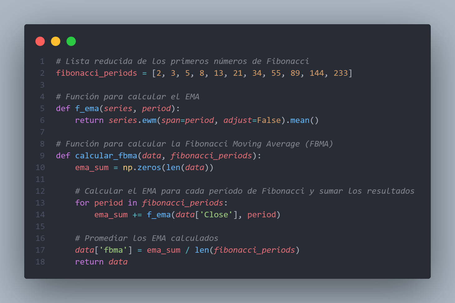 Fibonacci Moving Average (FBMA) es una media móvil compuesta que utiliza un conjunto de períodos derivados de la secuencia de Fibonacci (2, 3, 5, 8, 13, 21 ...). Se calcula al sumar las EMAs de los precios de cierre para cada uno de esos períodos y luego promediarlas. Esto permite capturar información de múltiples escalas temporales en una sola línea de tendencia suavizada.