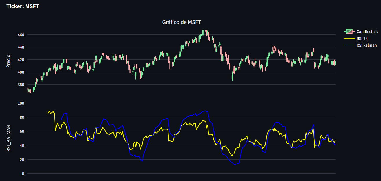 El uso del filtro de Kalman para el cálculo del RSI puede aportar mejoras significativas al suavizar y optimizar las señales de este indicador. Aunque el RSI clásico se calcula utilizando promedios móviles exponenciales (EMA), el filtro de Kalman puede aplicarse para mejorar su cálculo en escenarios con alta volatilidad o ruido de mercado.